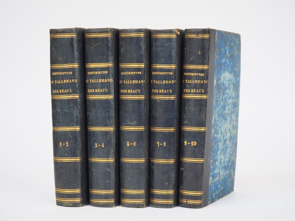 [TALLEMANT DES RÉAUX]. LES HISTORIETTES de Tallemant des Réaux. Paris, Delloye, 1840. 10 tomes reliés en 5 volumes in-12 ½ basane bleu nuit, dos lisse cloisonné de filets dorés, titre doré (Reliure de l’époque). Feuillets roussis. DEUXIÈME ÉDITION de Monmerqué, précédée d’une notice sur l’auteur, augmentée de passages inédits et accompagnée de notes et éclaircissements. 10 PORTRAITS en frontispice.