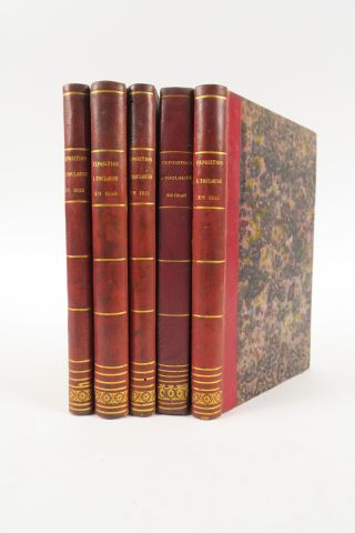 [TOULOUSE]. Expositions des produits des Beaux-Arts et de l'Industrie dans les galeries du Capitole à Toulouse. 1829-1835-1840-1845-1850. Toulouse, Impr. Tislet, Chauvin, Henault, Dupin. 5 vol. in-8. 1/2 chagr. rouge, dos lisses ornés de fil. et roulettes dor. (Rel. d'époque).