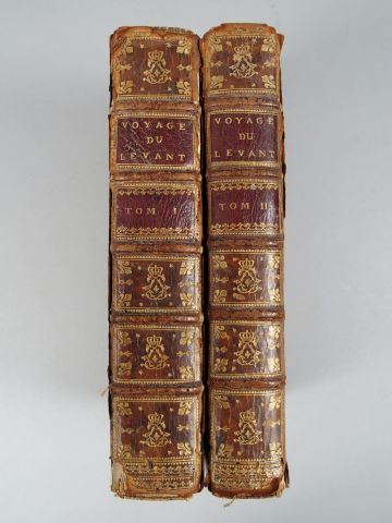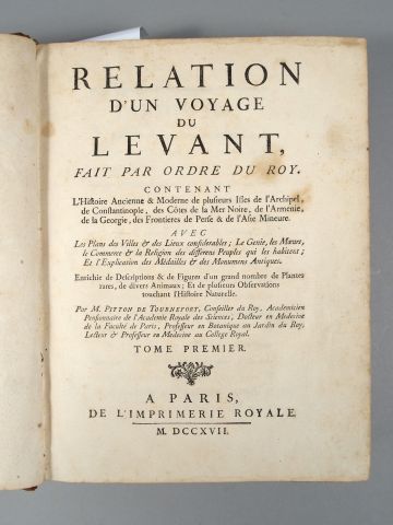 TOURNEFORT (Joseph Pittonde). Relation d'un voyage du Levant, fait par ordre du Roy. Contenant l'Histoire ancienne et moderne de plusieurs Isles de l'Archipel, de Constantinople, des Côtes de la Mer Noire, de l'Arménie, de la Georgie, des Frontières de Perse et de l'Asie Mineure. Paris, Imprimerie Royale 1717. 2 vol. in-4. Veau marbré, triple encadr. dor. sur les plats, chiffre couronné au dos (Rel. d'époque). Première édition du voyage du célèbre botaniste français, entrepris sur l'ordre de Louis XIV. Il apporta de nombreuses découvertes, notamment en botanique. Il est illustré de 150 planches. Us. à la reliure.