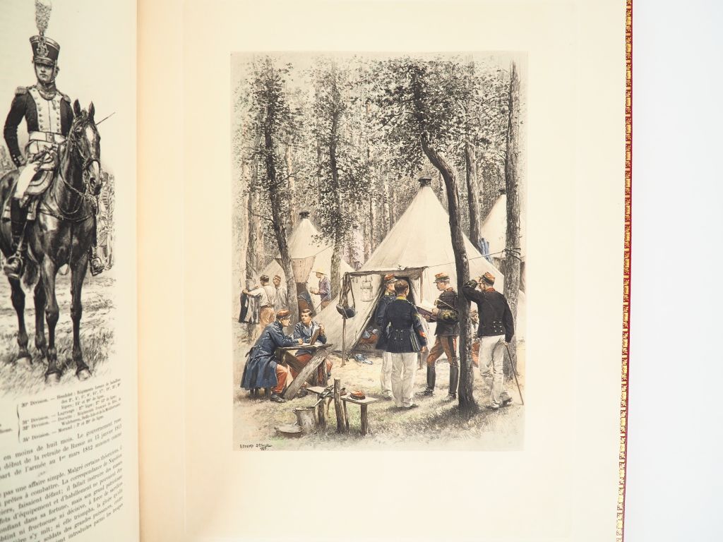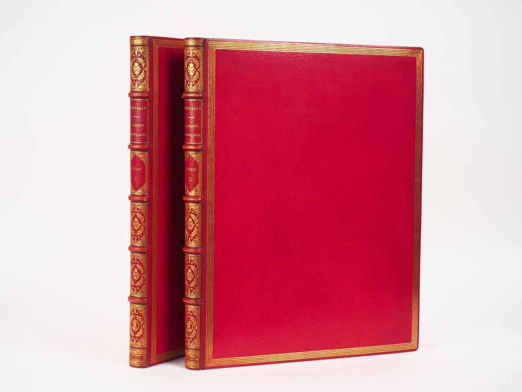 [UNIFORMOLOGIE]. DETAILLE (Éd.). L’ARMÉE FRANÇAISE. Texte par Jules Richard. P., Boussod, Valadon et Cie, 1885-89. Deux volumes grand in-folio maroquin rouge, encadrement de quadruple filet doré sur les plats, dos à nerfs orné aux petits fers dorés, titre doré, date en queue, large dentelle intérieure, tête dorée, étuis (Reliure de l’époque). ÉDITION ORIGINALE de cet ouvrage illustré de 2 frontispices, 280 figures dans le texte et 64 PLANCHES couleurs h.-t. reproduites en héliogravure d’Édouard DETAILLE (1848-1912). Tirage de luxe limité à 300 exemplaires (100 Japon et 200 Hollande). EXEMPLAIRE NOMINATIF imprimé sur Japon « pour Monsieur Édouard DETAILLE » (n°88) avec son monogramme « ED » doré dans le compartiment inférieur du dos de la reliure des 2 volumes. MAGNIFIQUE EXEMPLAIRE relié en maroquin de belle facture, étonnamment non signé. ¶ Vicaire, I-89.