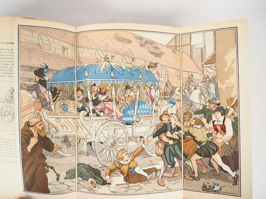 UZANNE (Octave). La locomotion à travers l'histoire et les mœurs. Illustrations dans le texte et hors-texte de Eugène Bourgoin. Nombreuses reproductions d'estampes anciennes. Paris, Ollendorff 1900. Fort volume gd in-8. Reliure demi veau blond, coins, pces de titre brune, couv. et dos 20 planches d'illustrations originales couleurs montées en tryptiques. Belle couverture illustrée imprimée sur papier rouge gaufré.