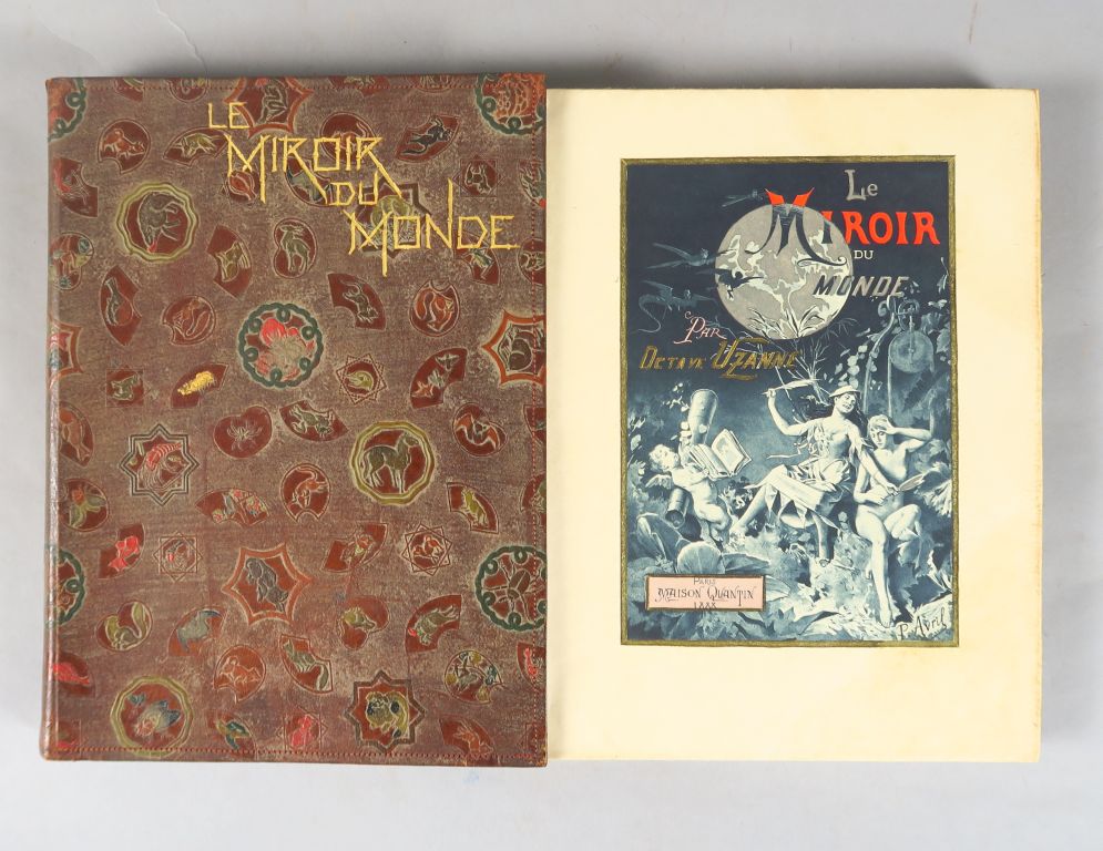 UZANNE (Octave). Le Miroir du Monde. Notes et sensations de la vie pittoresque. Illustrations en couleurs d'après Paul AVRIL. Paris, Quantin 1888. in-4. broché sous chemise de cuir estampée d'un décor japonisant en couleurs. Tirage : 2200 ex. 1/2000 Hollande, infimes pîqures à qqs pages