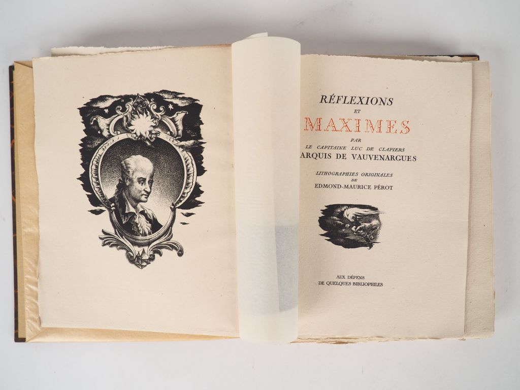 VAUVENARGUES (Marquis de). Reflexions et Maximes. Lithographies originales de Edmond Maurice Pérot. Aux dépens de quelques bibliophiles, (circa 1950) s.d. in-folio en ff. chemise et étui. 1/277 ex. sur Auvergne