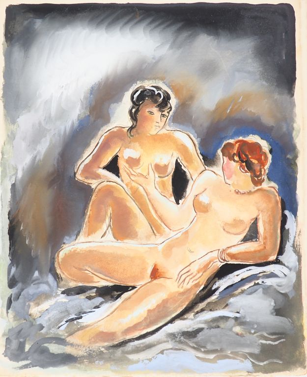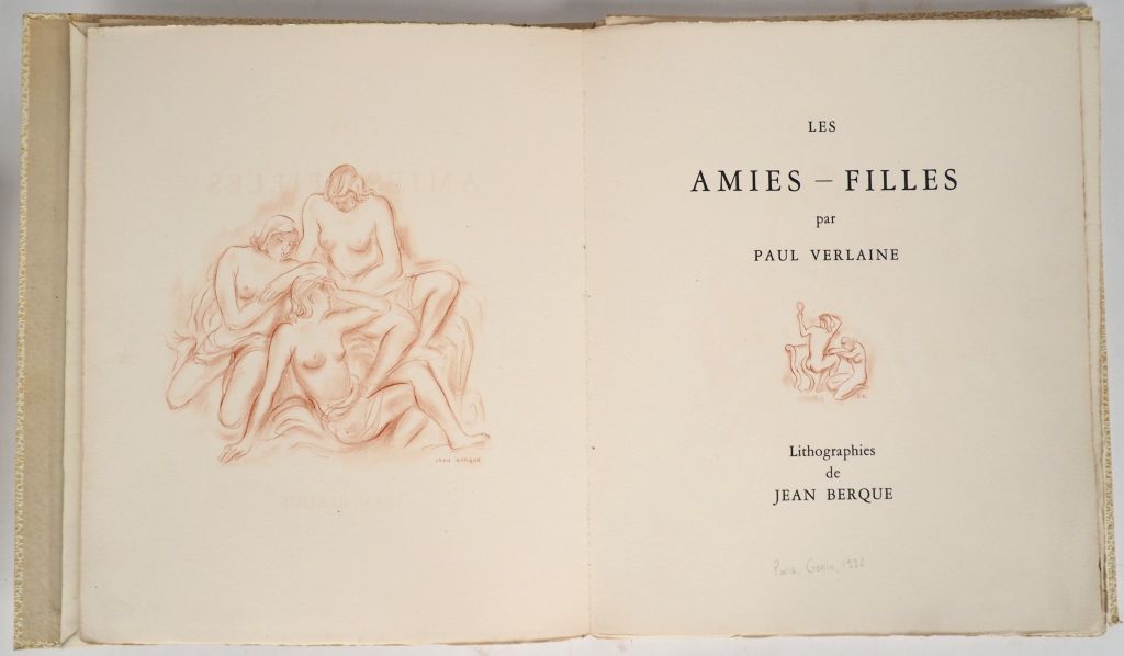 VERLAINE (P.). LES AMIES - FILLES. [P., Gonin, 1932]. Grand in-4 broché, chemise et étui. ÉDITION ILLUSTRÉE de 35 LITHOGRAPHIES originales libres tirées en sanguine de Jean BERQUE. Tirage limité à 99 exemplaires numérotés sur beau vélin à la forme. EXEMPLAIRE NOMINATIF, justifié « Exemplaire de M. André Gonin », signé à la mine de plomb par l’artiste et l’éditeur [Philippe Gonin]. Bien que non numéroté, cet exemplaire correspond aux 30 exemplaires enrichis d’un DESSIN ORIGINAL à pleine page (aquarelle et gouache) et d’une SUITE de 8 planches inédites. ¶ Pas dans Dutel ni Pia.