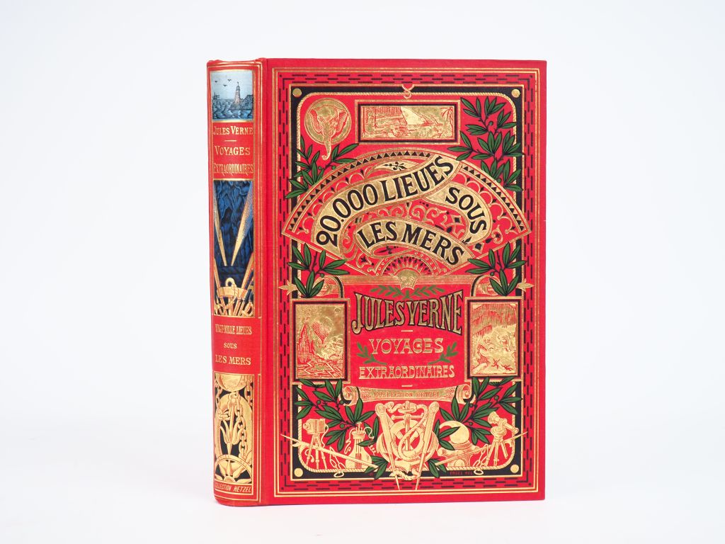 VERNE (J.). 20 000 LIEUES SOUS LES MERS. Illustré de 111 dessins par De Neuville et Riou gravés par Hildibrand. Paris, Hetzel, [1905-1910]. Grand in-8 percaline rouge de l'éditeur ornée de fers spéciaux, dos au phare, type « à un éléphant avec titre dans l'éventail », tranches dorées. ÉDITION grand in-8 illustrée. 6 PLANCHES couleurs reproduites en chromotypographie. ¶ Jauzac, 184.