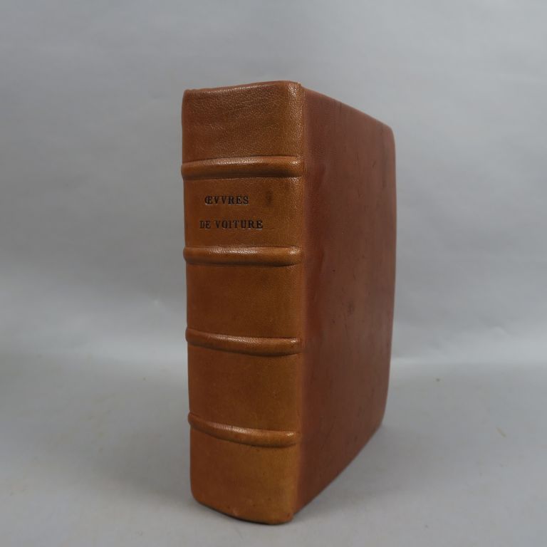 VOITURE (Vincent). Les Œuvres. Troisième édition revue, corrigée et augmentée. Paris, Courbé 1652. in-4, 19 ff.-709 pp.-210 pp.-9 ff. Maroquin janséniste havane (Rel. moderne). Troisième édition en partie originale, illustrée d'un frontispice par Mellan, d'un portrait de Voiture et d'une vignette de titre par Picart. Le frontispice a été remargé. Petites taches sur la tranche en fin de volume.