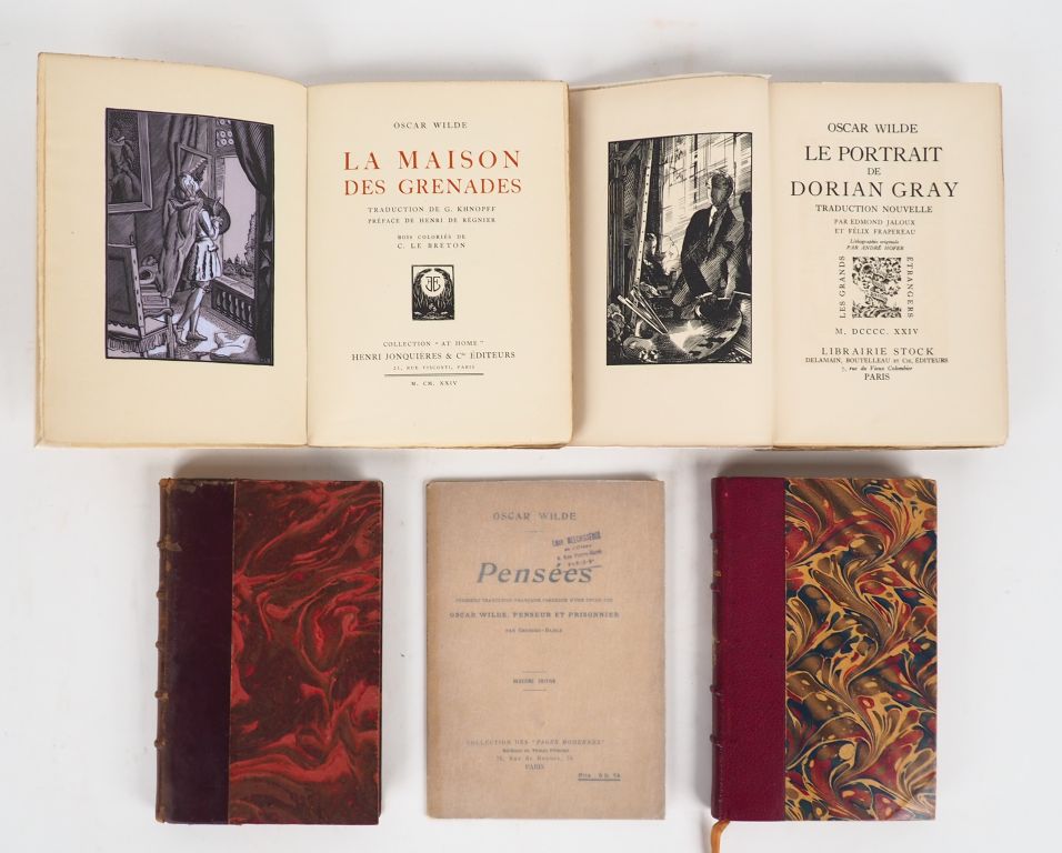 WILDE (O.). ENSEMBLE DE 5 OUVRAGES. - DE PROFUNDIS. Mercure de France, 1905. Mention fictive de « Quatrième édition ». Reliure ½ maroquin époque, plats de couverture conservés. - DE PROFUNDIS. Suivi de La Ballade de la Geôle de Reading. Mercure de France, 1921. Mention fictive de « 23e édition ». Reliure ½ basane marron foncé époque, plats de couverture conservés. Dos éclairci, épidermures. - PENSÉES. Éd. du Temps Présent, [1912]. - LA MAISON DES GRENADES. Jonquières, 1924. Bois coloriés de C. Le Breton. Un des 1100 vélin de Rives num. - LE PORTRAIT DE DORIAN GRAY. Stock, 1924. Frontispice par André Hofer. Un des 1600 pur fil num.