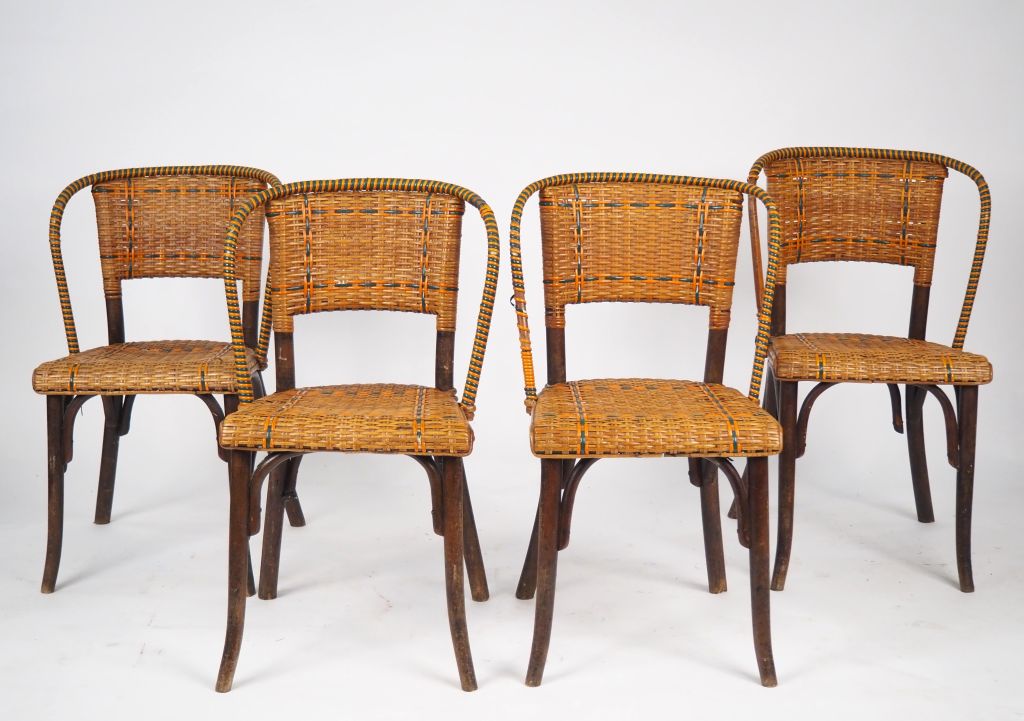 4 chaises bistrot en bois, assise et garniture en rotin et composition.