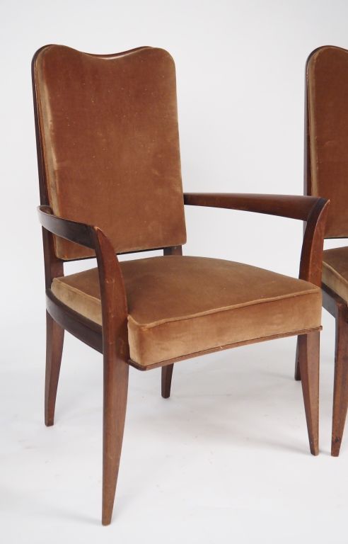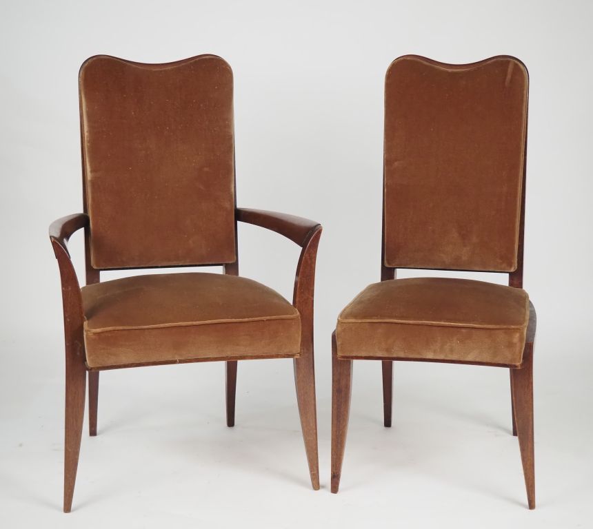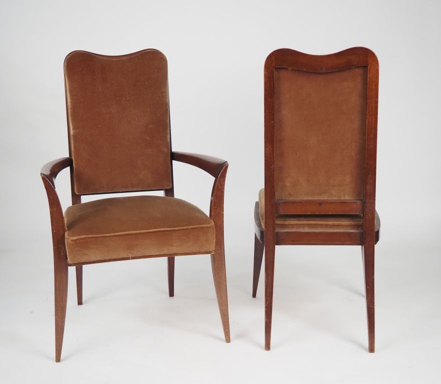 4 fauteuils et une paire de chaises de style 1940, en acajou, garniture de velours foncé. (un fauteuil accidenté)