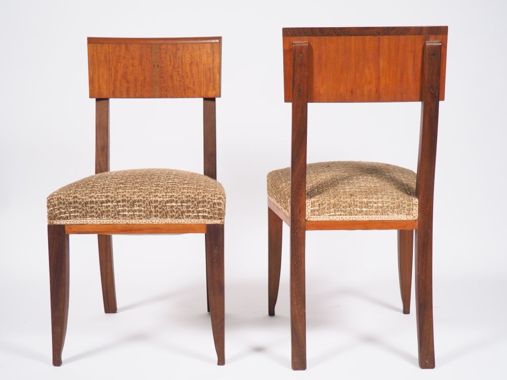 6 chaises de salle à manger 1940 en bois exotique, garntiure de tissu beige.