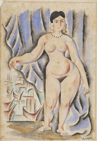 André LHOTE, 1885-1962 Nu au rideau bleu aquarelle (légère insolation et rousseurs) signée en bas à droite 27x19 cm Un certificat de Madame Bermann Martin sera remis à l’acquéreur. Expert : Cabinet MAKET