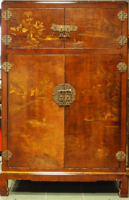 Armoire en laque, à décor de paysages lacustres animés, ouvrant à quatre portes. Chine, XIXème siècle.