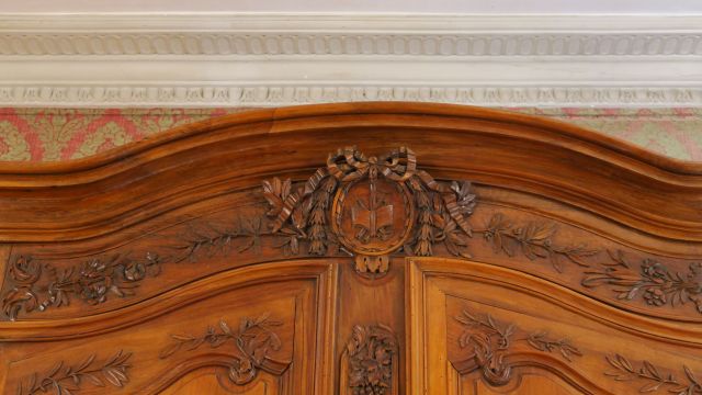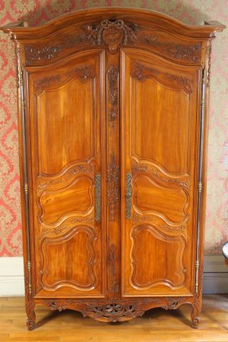 Armoire provençale Louis XV – Louis XVI en noyer et fortement sculpté, à décor de pampres, de fleurs, de branches d’olivier, de trophées d’instruments de musique et de nœuds de ruban, ouvrant à deux portes à trois panneaux, ceinture ajourée, pieds coquille, entrée de serrure trèfle