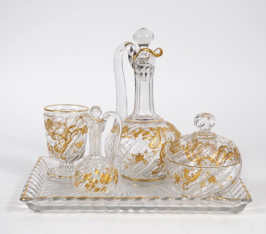 BACCARAT. Service de nuit en cristal à décor émaillé doré de rinceaux feuillagés et de fleurs. Comprenant : deux flacons, un verre à pied, une bonbonnière, un plateau. Signé.