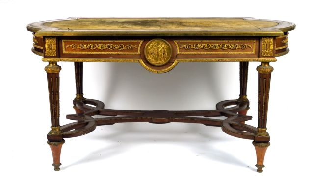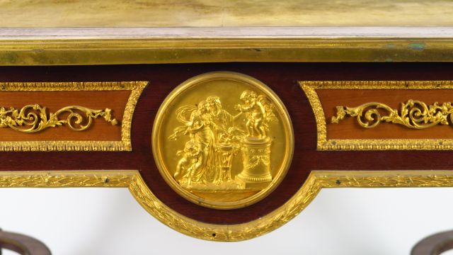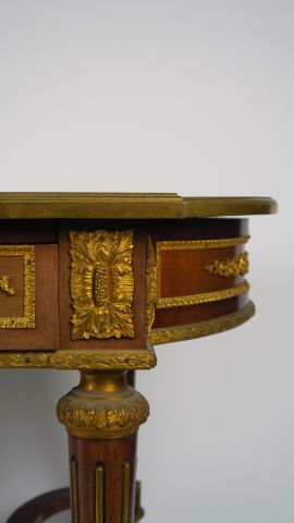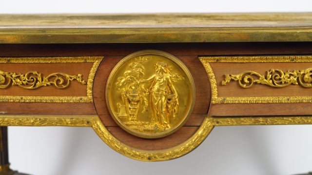 BEFORT Jeune. Table de milieu Napoléon III de style Louis XVI, belle ornementation de bronze. Signée. Dim. : 150 x 74.5 x 85.5 cm.