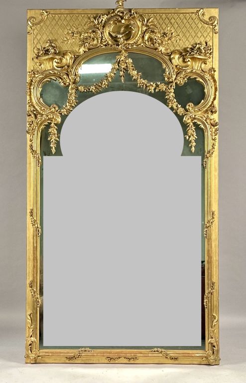 Belle glace Napoléon III de style Rocaille en bois sculpté et doré, à décor de feuillage, de guirlande de fleurs et de rocailles. Dim. 234 x 130 cm (manque)