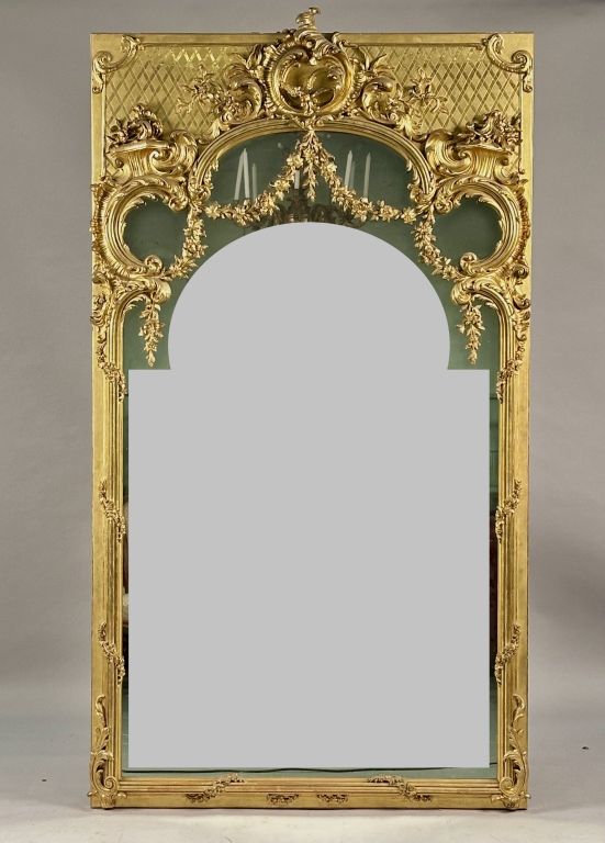Belle glace Napoléon III de style Rocaille en bois sculpté et doré, à décor de feuillage, de guirlande de fleurs et de rocailles. Dim. 230 x 130 cm