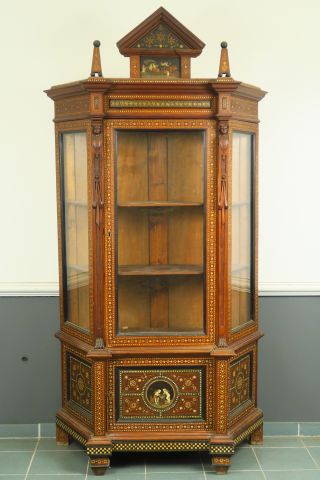 Belle vitrine italienne XIXème en marqueterie à décor d'amours, de fleurs et rinceaux (quelques manques et accidents). Dim. : 198,5 x 111,5 x 47 cm.