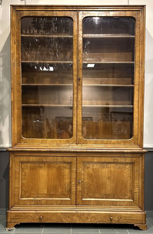 Bibliothèque Restauration en placage de bois clair, ouvrant à deux portes vitrées en partie supérieure et deux vantaux. Dim. 245 x 156 x 44 cm