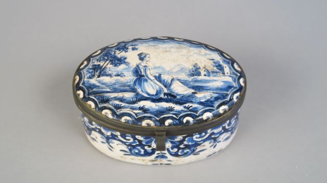 Boite ovale en faïence de Delft, à décor de jeune femme sur fond de paysage