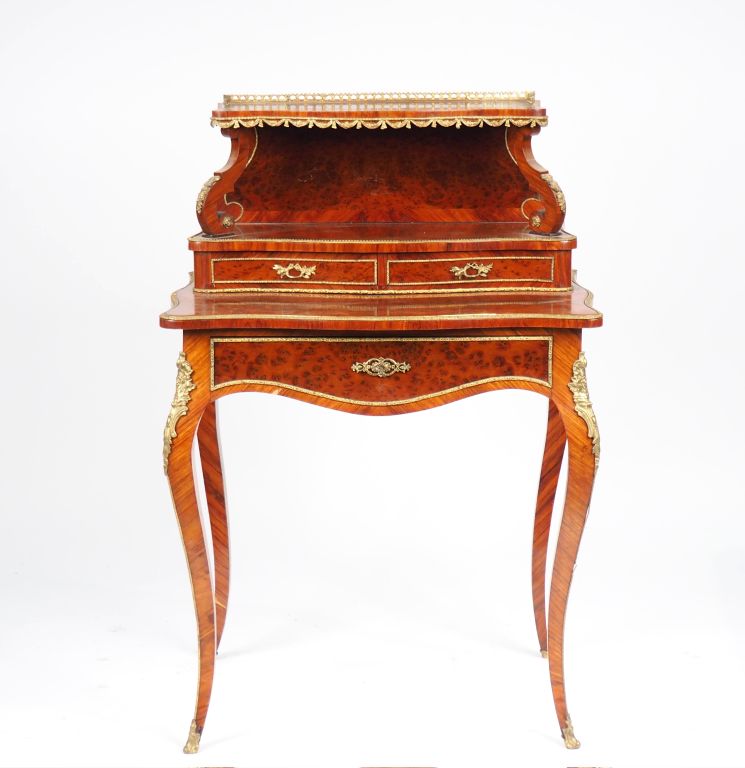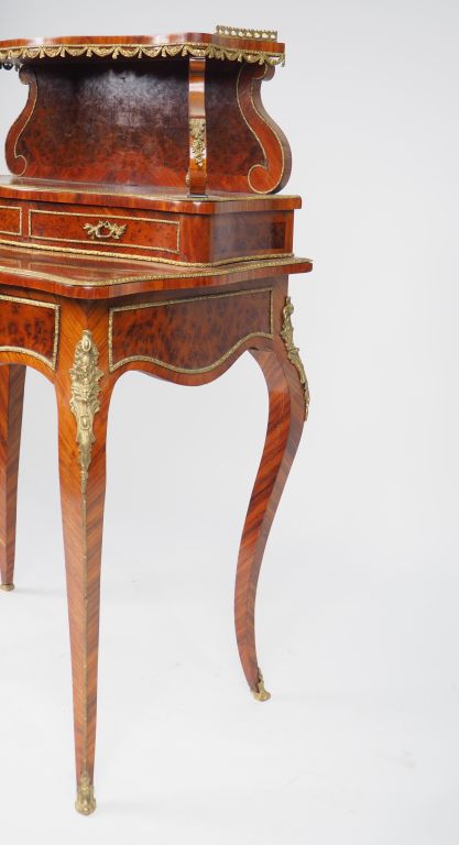 Bonheur du jour Napoléon III de style Louis XV en bois et bois de placage, ornementation de laiton à décor de draperies et de motifs feuillagés. Dim. 109 x 72 x 48 cm.