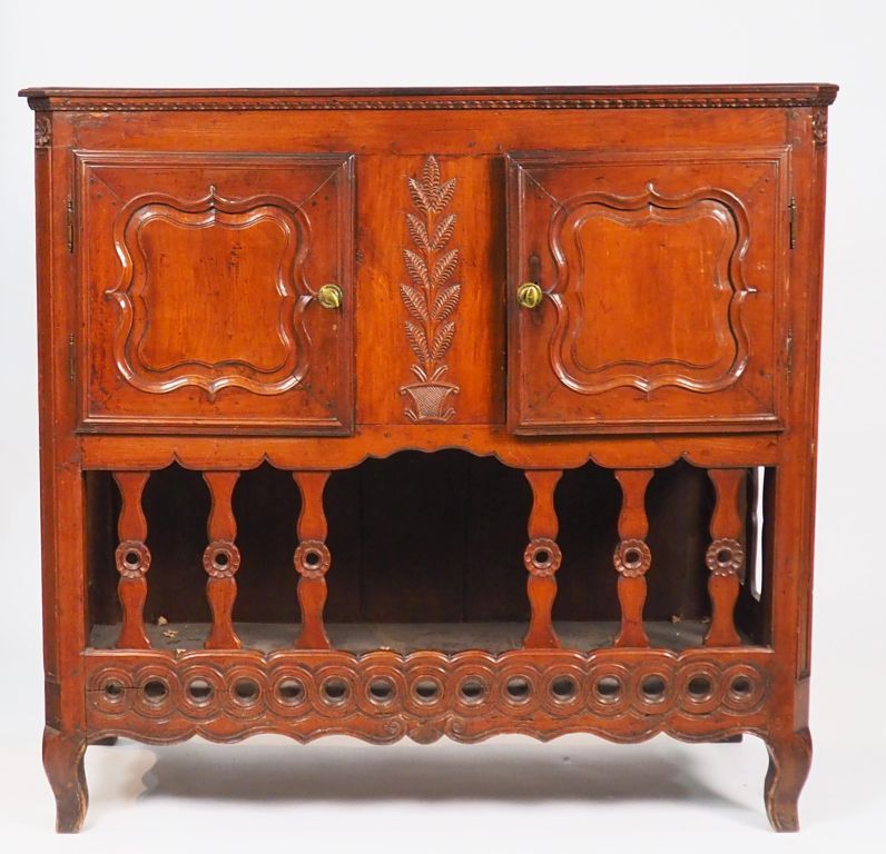 Buffet bas de style Louis XV en merisier mouluré et sculpté, ouvrant à deux portes, partie basse ajourée à décor de balustres, plateau bois. Dim. 112 x119 x 50 cm (petites restaurations)
