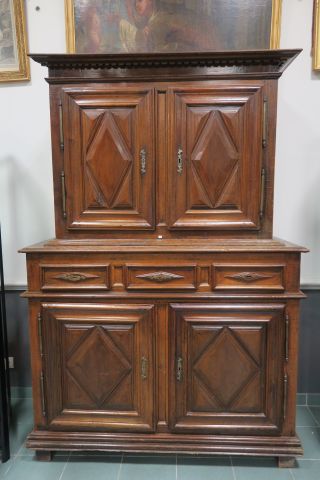 Buffet deux corps Louis XIII en noyer mouluré, ouvrant à quatre portes et deux tiroirs