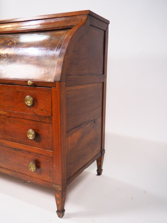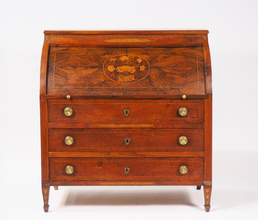 Bureau à cylindre fin XVIIIème début XIXème en noyer et marqueterie, à décor de bouquet de fleurs ouvrant à un tiroir à cylindre et trois tiroirs, dessus bois. Dim. 109 x 103 x 57 cm