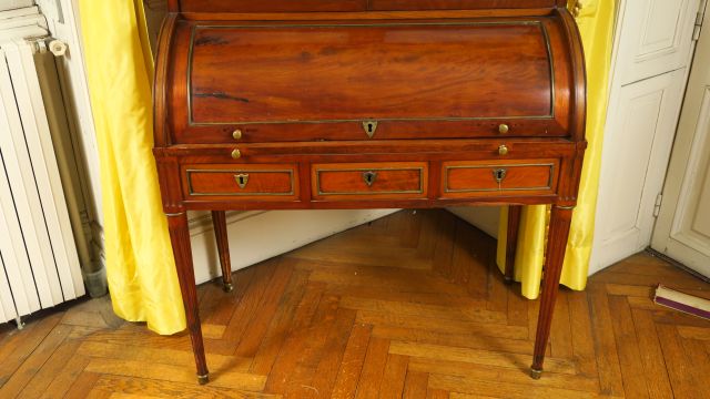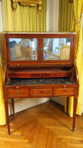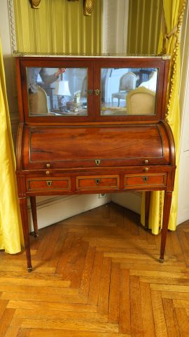 Bureau à cylindre Louis XVI en acajou et placage d’acajou, deux vantaux à fond de glace et trois tiroirs en ceinture, dessus marbre blanc à galerie, pieds cannelés (petits accidents et léger ensolement)