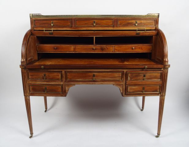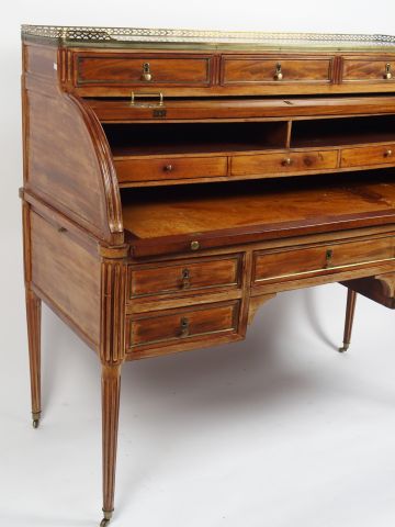 Bureau cylindre Louis XVI en acajou et placage d'acajou, dessus marbre blanc à galerie.