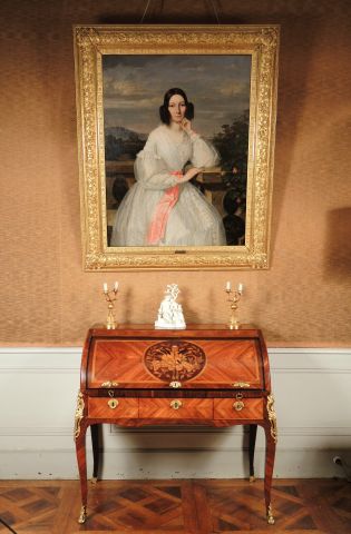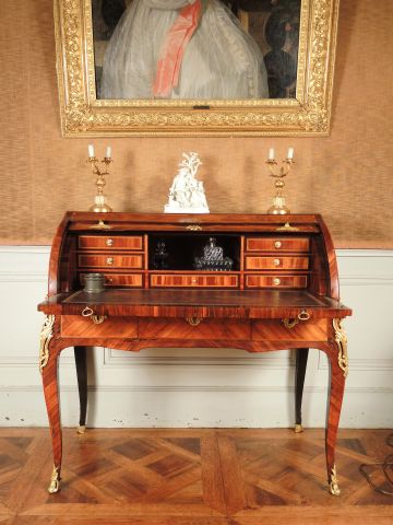 Bureau cylindre Transition Louis XV-Louis XVI en placage de bois de rose et de bois de violette, filet de bois vert, abattant marqueté dans une réserve de trophée de musique, un rehaut de nacre, ouvrant à trois tiroirs en ceinture, intérieur à deux niches et quatre tiroirs, pieds galbés, riche ornementation de bronze doré