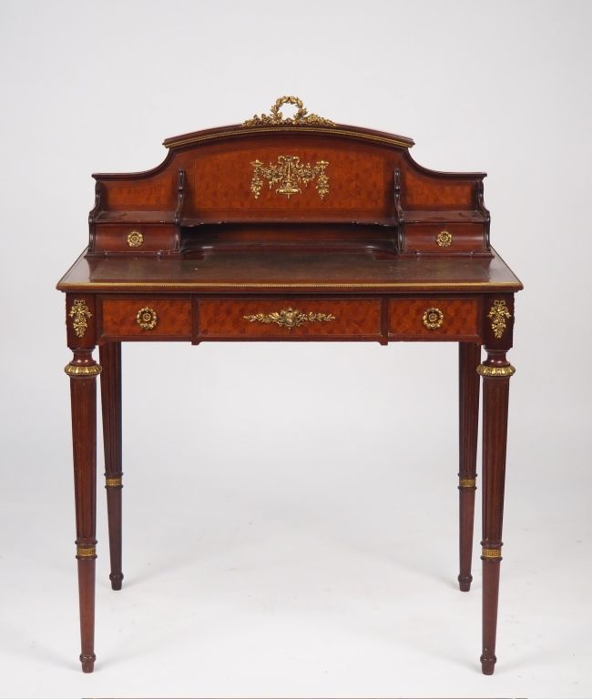 Bureau de dame et sa chaise cannée de style Louis XVI en placage d'acajou et marqueterie d'acajou à décor de cubes, belle ornementation de bronze doré. Dim. 104 x 82 x 53 cm