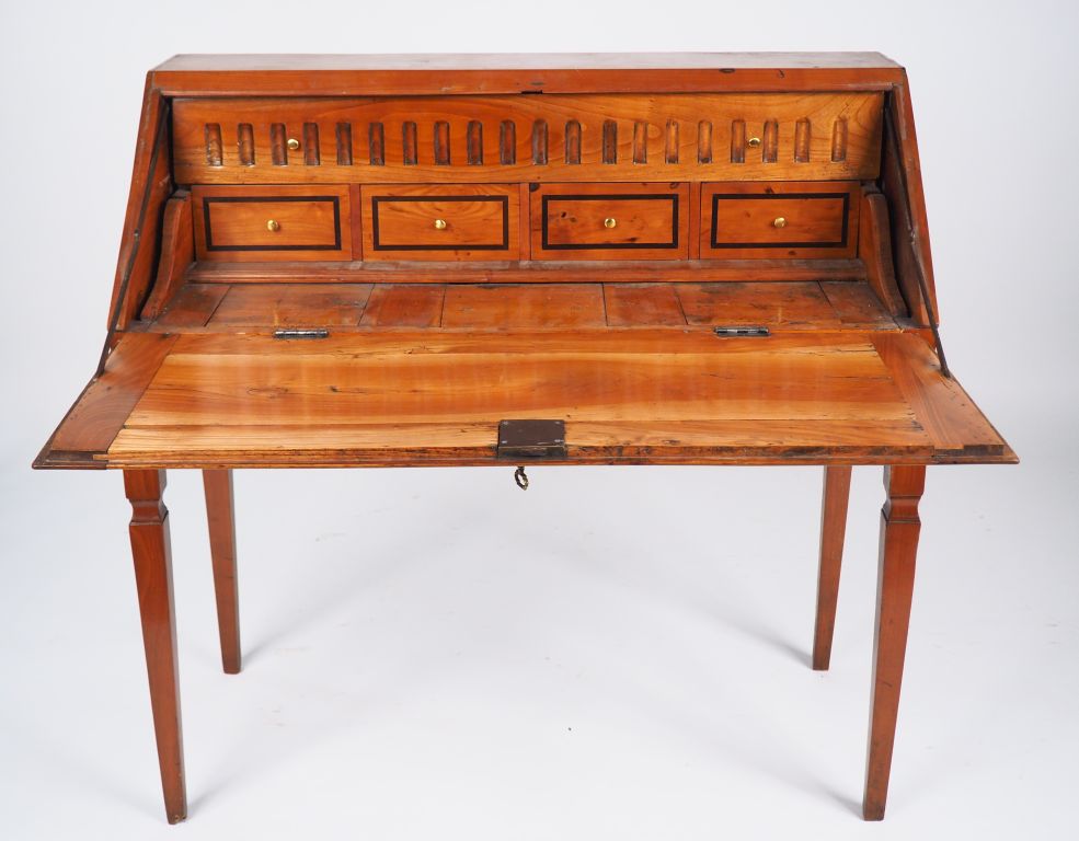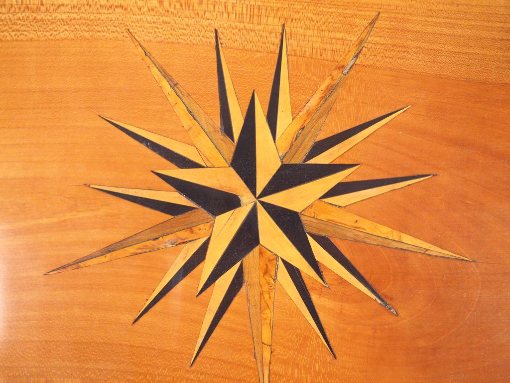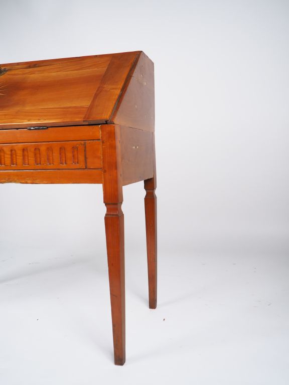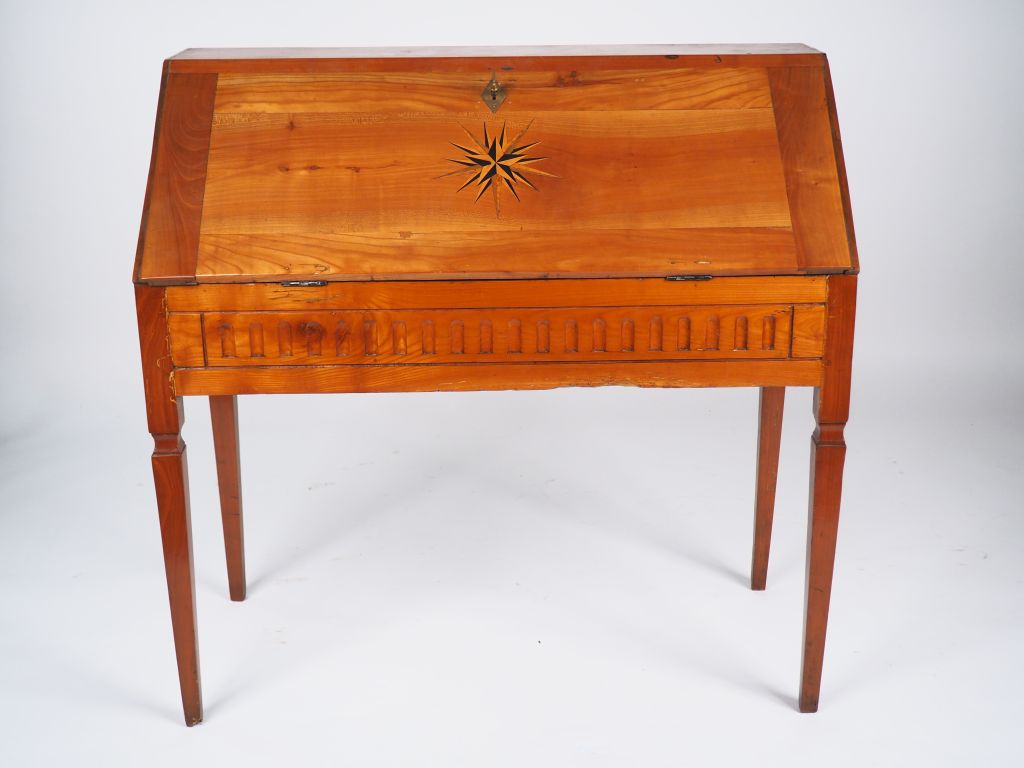 Bureau de pente de style Louis XVI en bois fruitier et marqueterie à décor de rose des vents, ouvrant à un abattant. Dim. 96,5 x 98 x 46 cm.