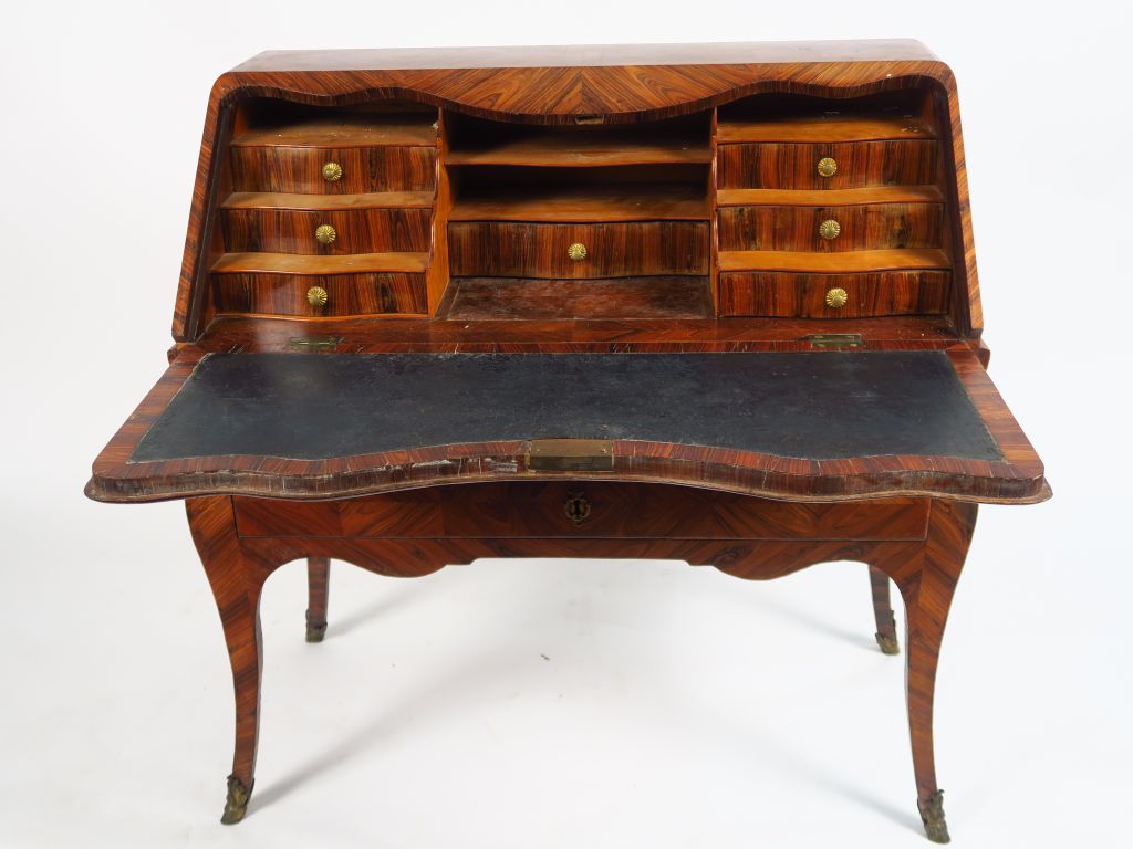 Bureau de pente Louis XV en marqueterie de bois de violette, à décor de croisillons, placage en aile de papillon, ouvrant à un abattant et trois tiroirs, pieds galbés. 101 x 99 x 50 cm