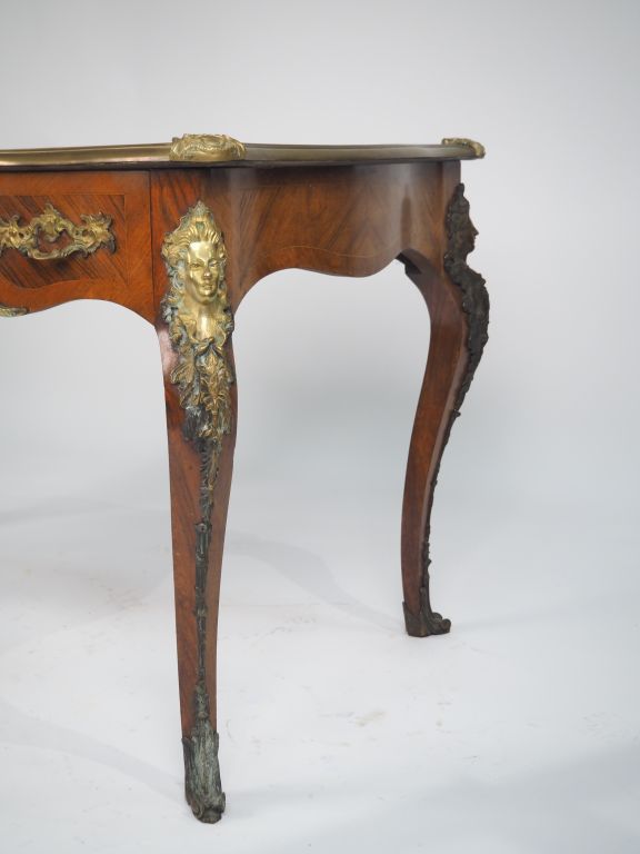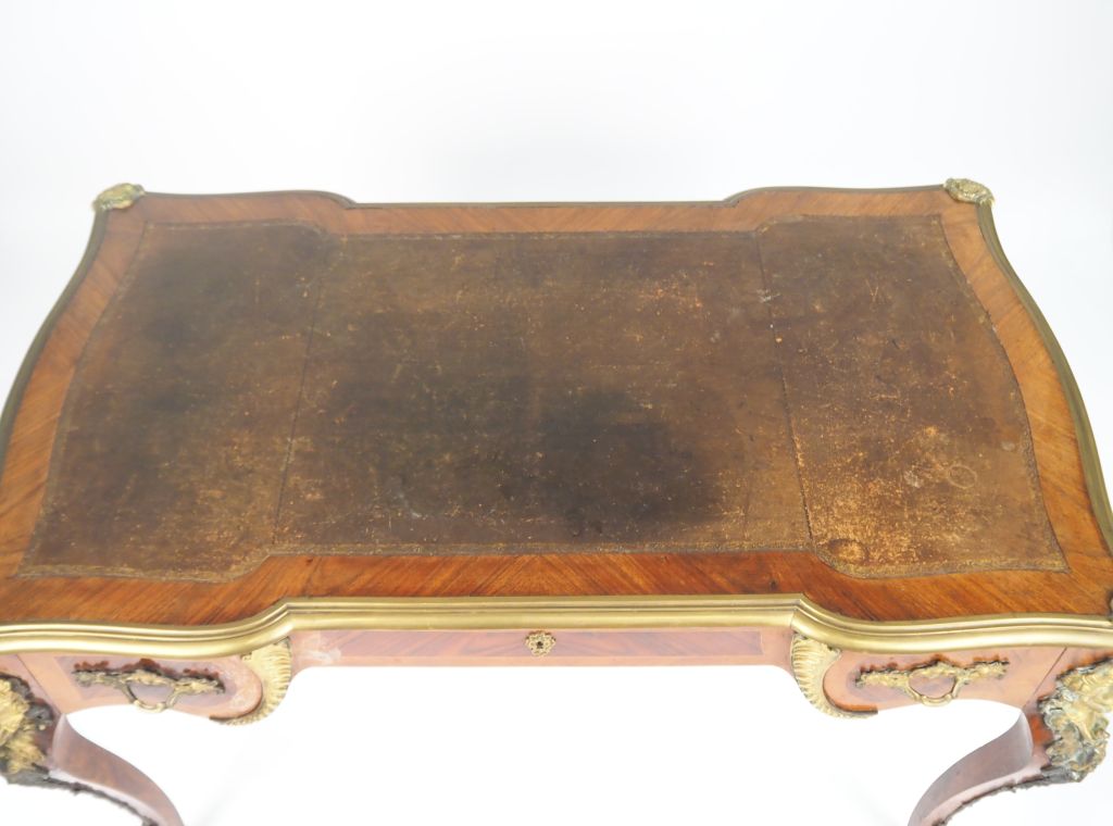 Bureau plat Napoléon III de style Louis XV en frisage et marqueterie, plateau dessus cuir, ouvrant à un tiroir en ceinture, pieds galbés, riche ornementation de bronze et laiton à décor d'espagnolettes, pieds sabot. Dim. 76 x 128 x 77 cm