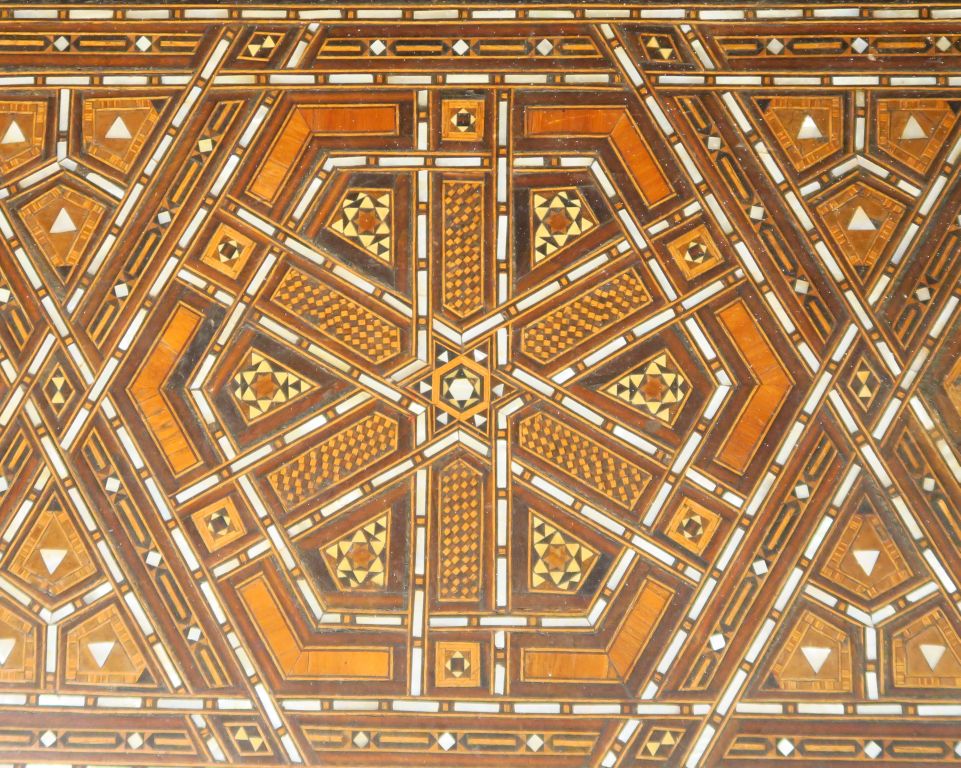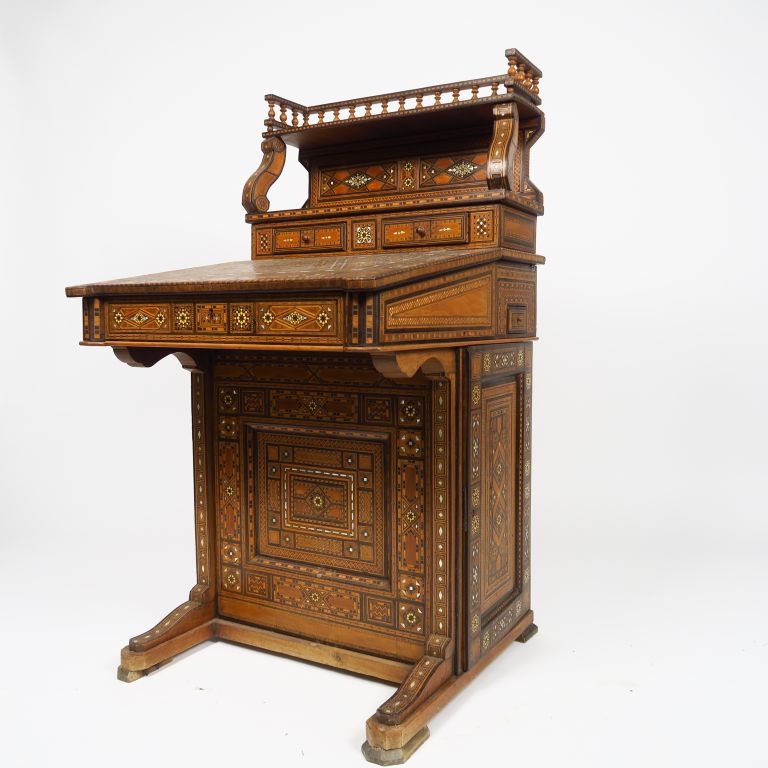 Bureau syrien 1900 en marqueterie ouvrant à deux tiroirs, un abattant et une porte latérale. Dim. : 67 x 114 x 61 cm.