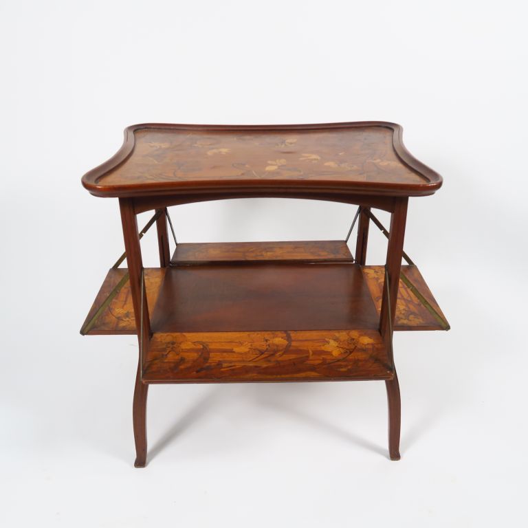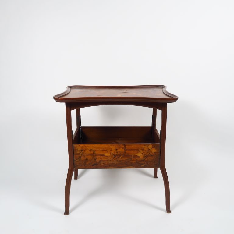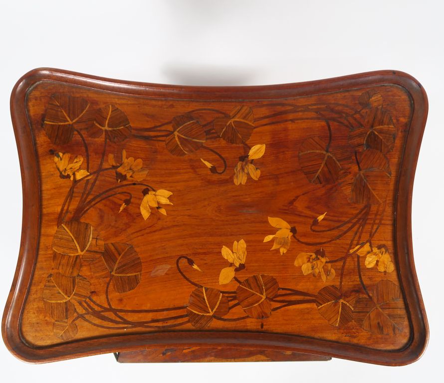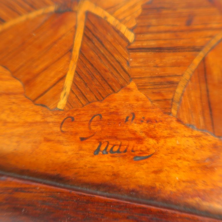C. GAUTHIER à Nancy. Guéridon Art Nouveau en marqueterie à décor d'orchidées. Signé Dim. 76,5 x 88,5 x 66,5 cm