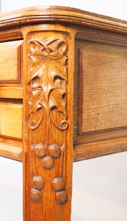 Cabinet de travail Art Nouveau en chêne sculpté à décor de houx, très belles poignées de tirage en bronze comprenant : - une bibliothèque Dim. 180 x 160 x 43 cm - un bureau ministre Dim. 75 x 158 x 89 cm - un fauteuil gondole garniture de cuir brun