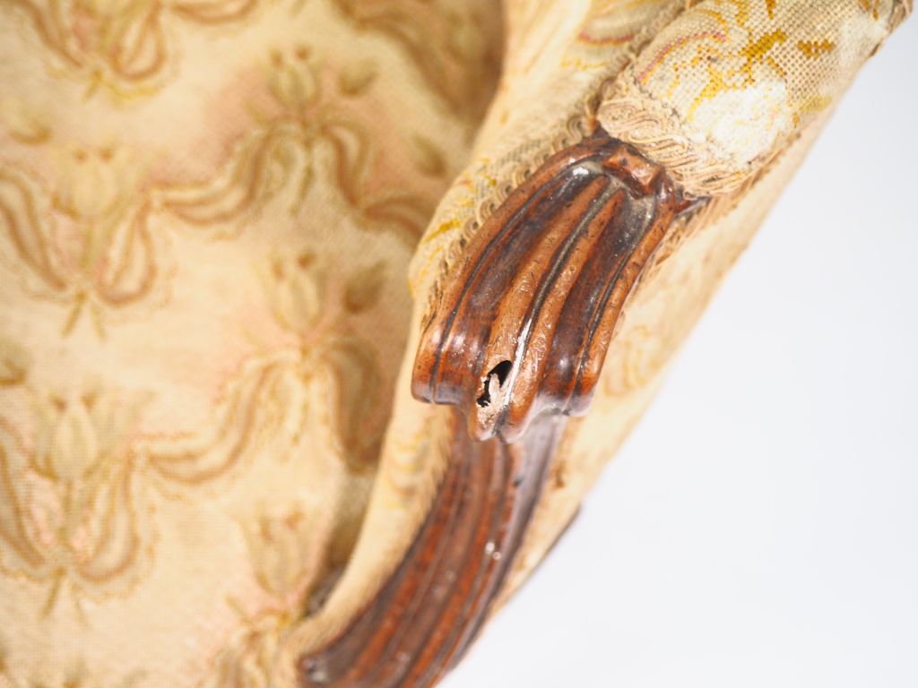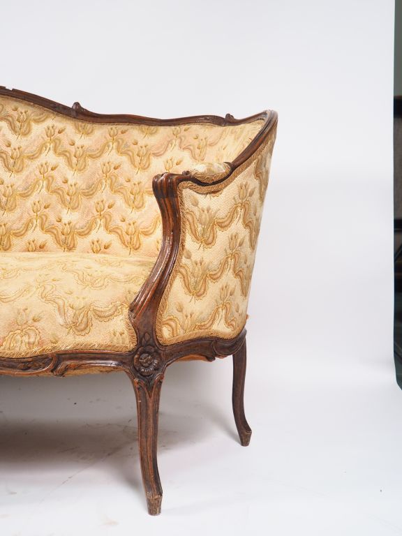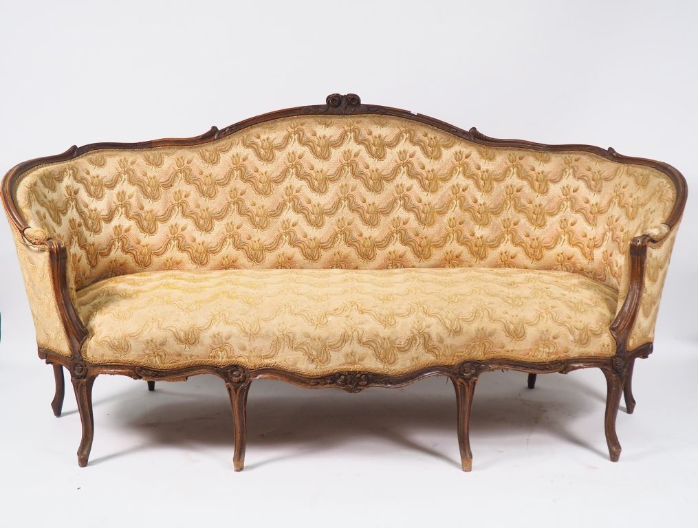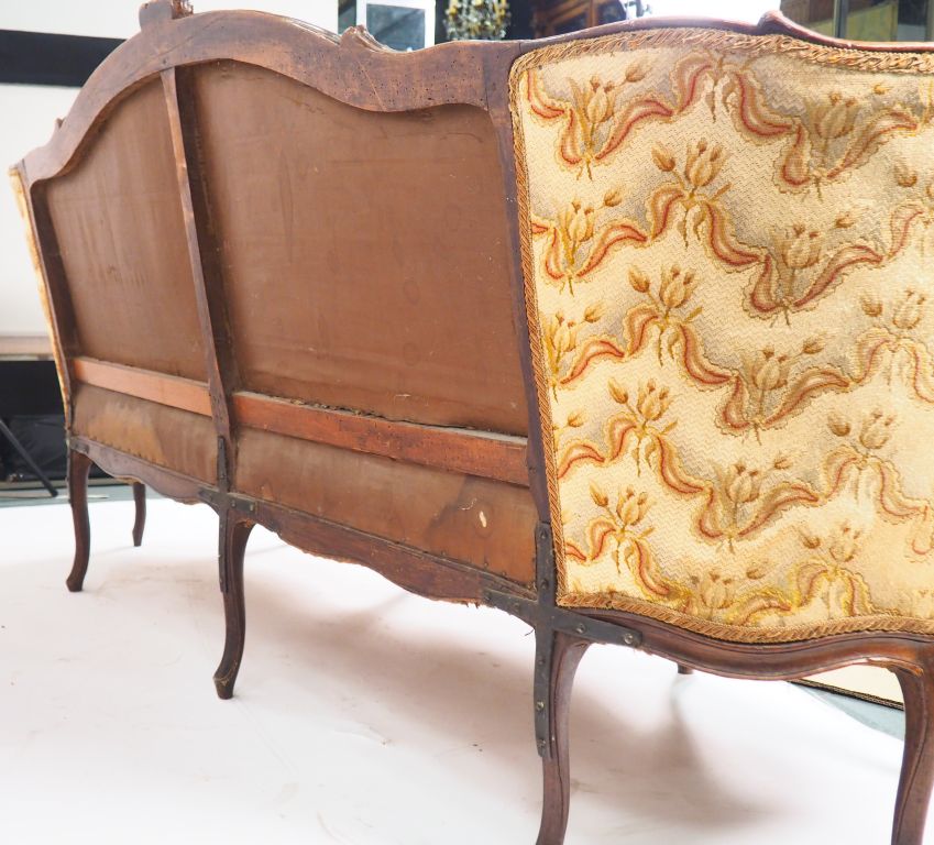 Canapé corbeille Louis XV en noyer mouluré et sculpté, à décor de fleurs, huit pieds, (renforts métalliques aux pieds et à la ceinture arrière). Dim. 102 x 206 x 90 cm
