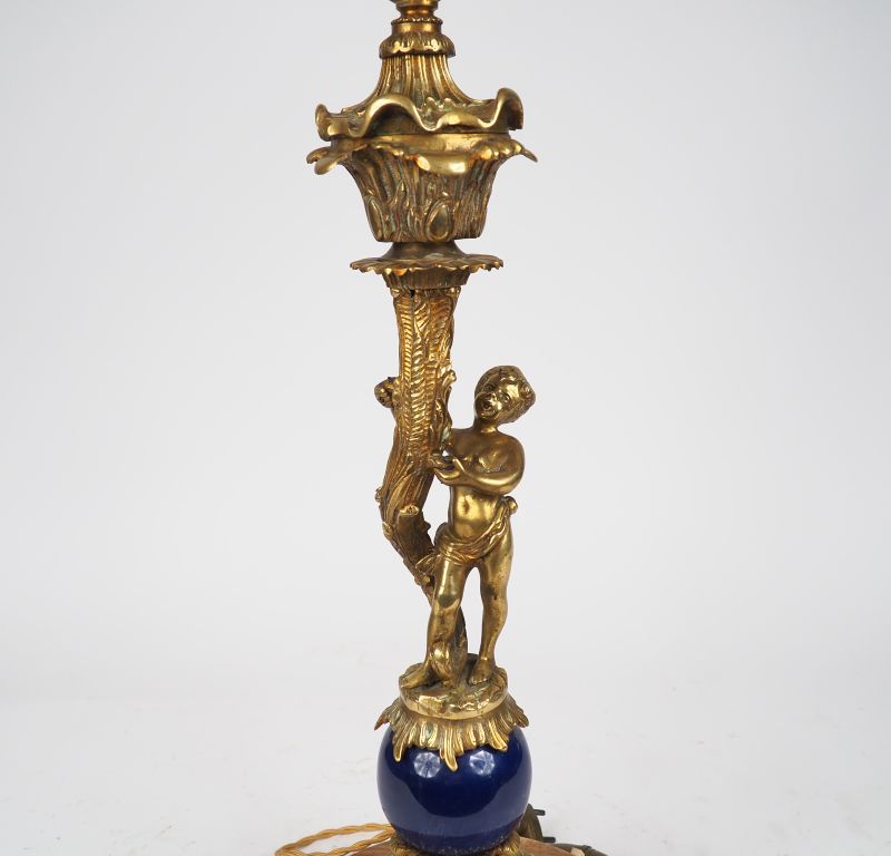 Candélabre en bronze de style Renaissance à décor d'un angelot porte-torchère, sur un socle en onyx brun. H. 62 cm.