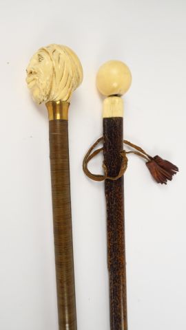 Canne 1900, pommeau en ivoire à décor de visage d'homme enturbanné. On y joint une canne, pommeau en ivoire en forme de boule.