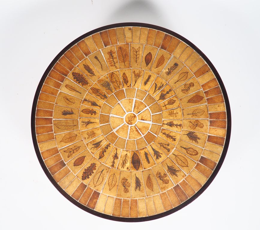 CAPRON. Table basse circulaire plateau en céramique brune, à décor de feuilles fossilisées. Diam. 95 cm
