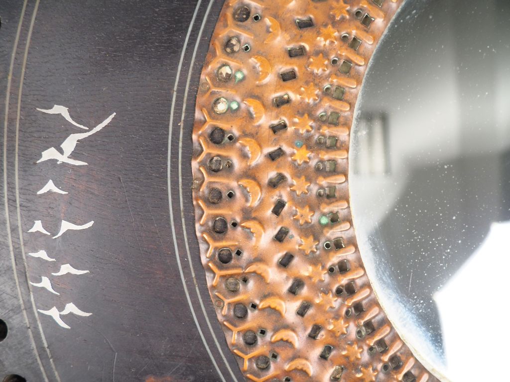 Carlo BUGATTI. Miroir en bois noirci incrusté d'étain et cuivre martelé et ajouré. (soies en mauvais état) Diam. 55 cm