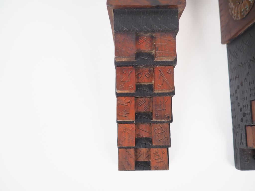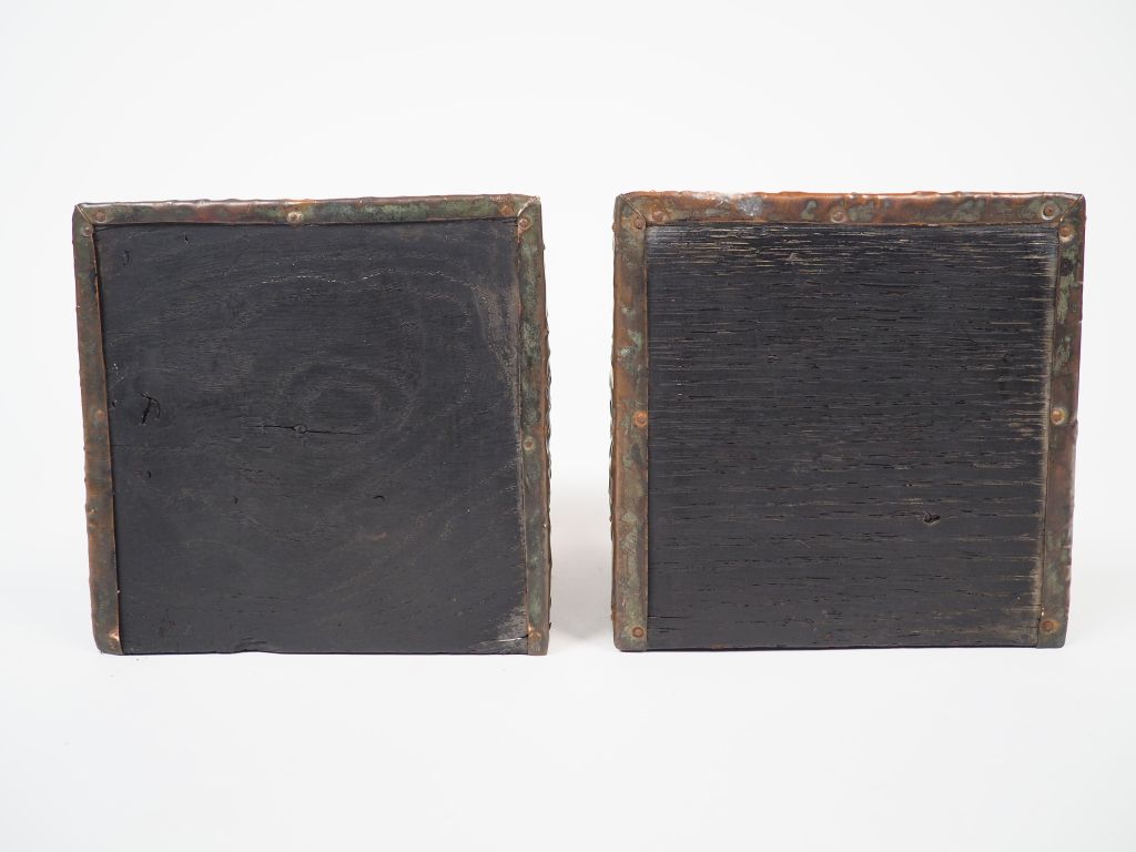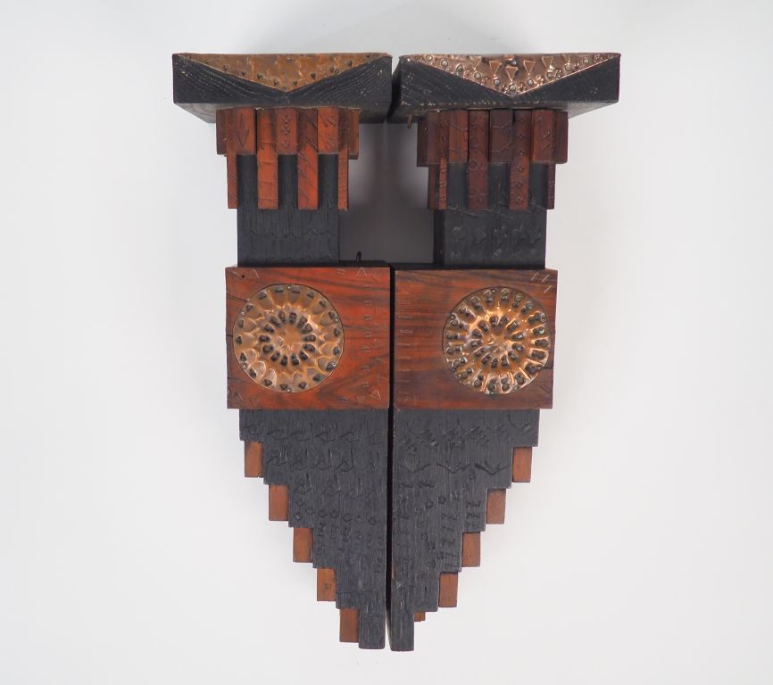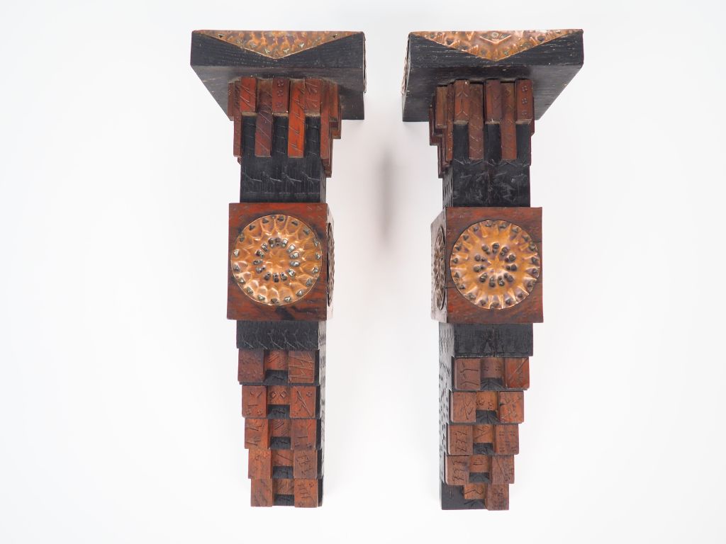 Carlo BUGATTI. Paire de sellettes d'appliques en noyer, bois teinté et cuivre martelé et ajouré. (quelques manques) Dim. 40 x 13,5 x 13 cm
