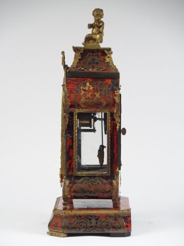 Cartel Napoléon III de style Régence en marqueterie Boulle, écaille rouge et laiton, riche ornementation de bronze doré (quelques manques sur le côté). H. avec socle : 45 cm
