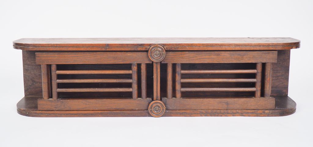 Charles DUDOUYT. Etagère murale en chêne à décor de deux spirales en relief, deux glissants ajourés. Dim. 23,5 x 97,8 x 21 cm.