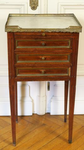 Chevet de style Louis XVI en bois naturel, ouvrant à trois tiroirs, dessus marbre blanc à galerie