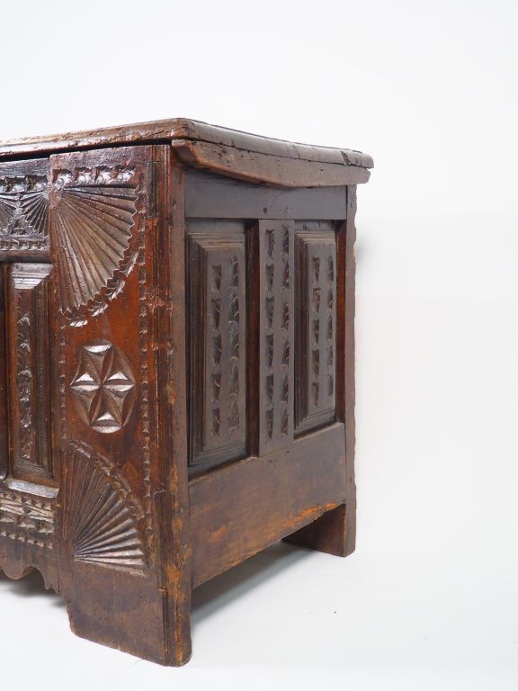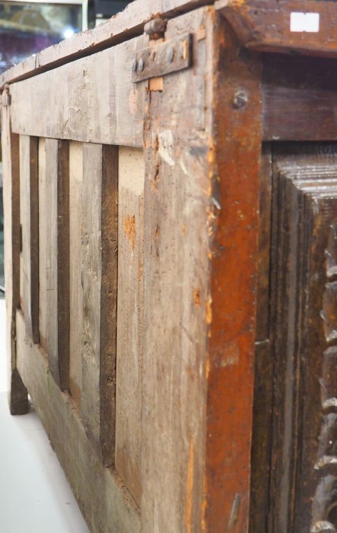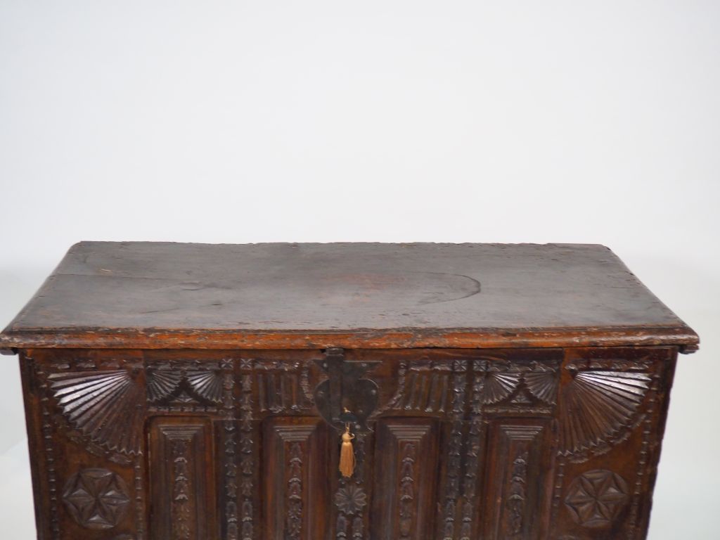 Coffre rustique XVIIème France ou Espagne, à décor de motifs géométriques et feuillagés sculptés. (accidents) Dim. 80 x 134 x 56 cm