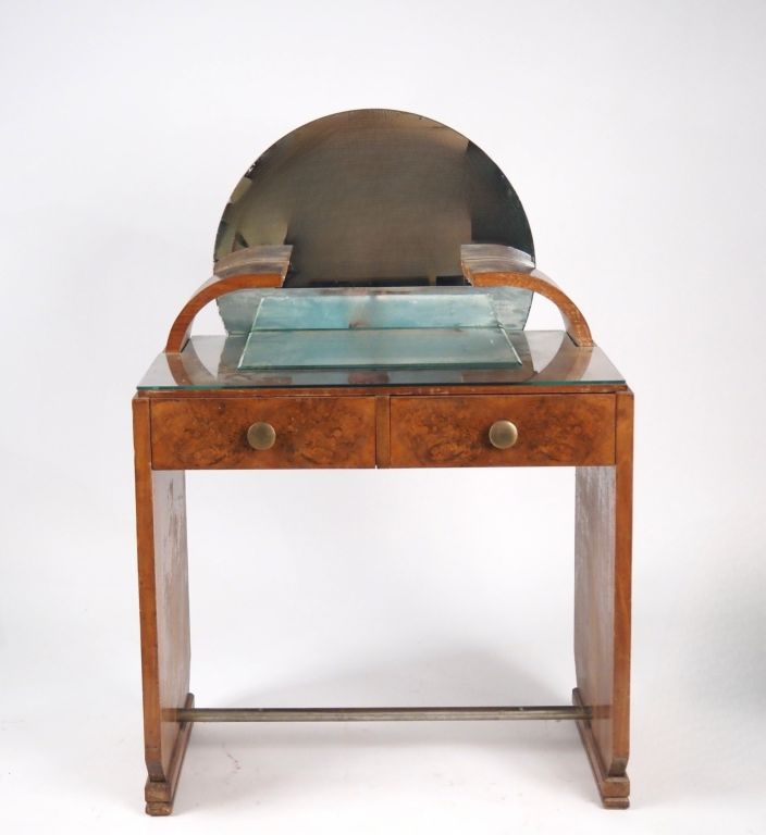 Coiffeuse Art Déco en bois, bois de placage et métal chromé, ouvrant à deux tiroirs surmontée d'un miroir rond. Dim. 118 x 81 x 52 cm