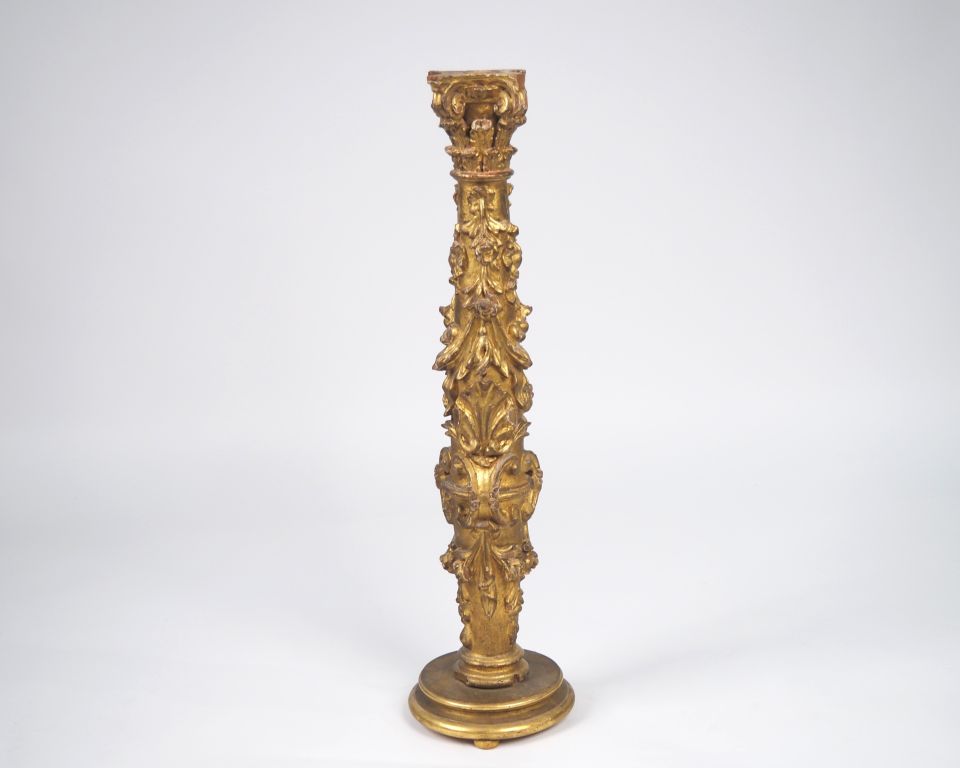 Colonne de style composite XVIIIème en bois sculpté et doré, à décor de feuillage et de fruits. Socle postérieur H. 88,5 cm (quelques sauts de dorure)